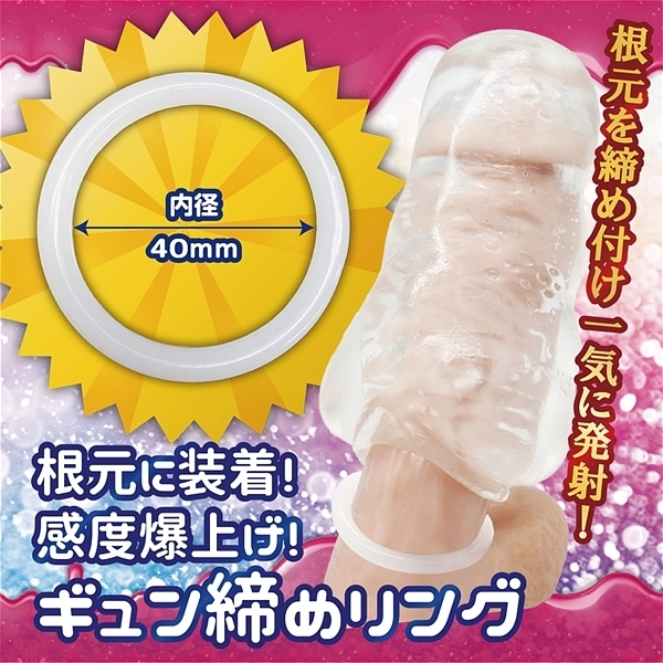 仕様:非貫通型 パッケージ:16.0×10.0×6.0cm 本体:11.5×5.5×5.5cm・リング直径5.0cm・内径4.0cm 重量:140gとろけるゼリーのようなホールと、ギュッと締めるリングの快感満点セット!とろけるやわもちホールと感度爆上げのギュン締めリング、さらにたっぷり楽しめるローションが付属。●イボイボしめリング |