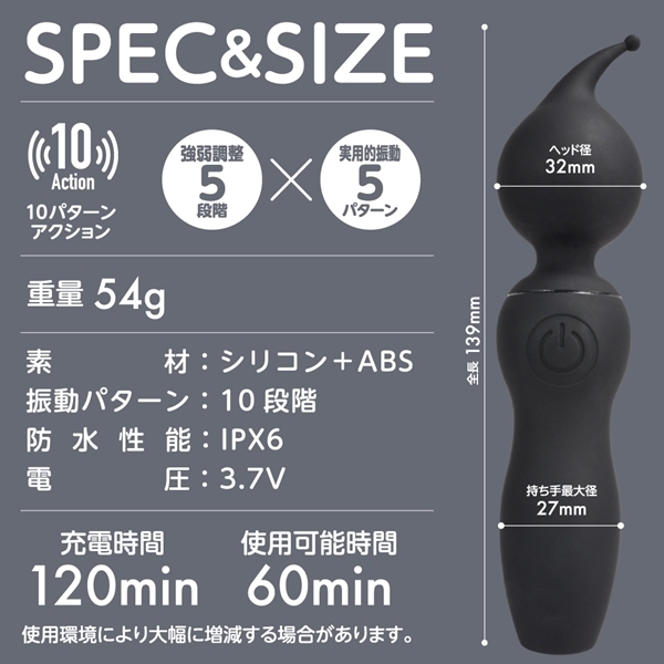 仕様:パッケージ:16.6+ヘッダー3.0×5.7×5.1cm 本体:13.9×ヘッド3.2cm(持ち手:2.7cm) 重量:54g USB充電式コンパクトで使いやすいピンポイント刺激が可能なデンマです♪先端はピンポイント刺激に特化した形状を採用し、心地よい肌触りと柔らかさにこだわったオールシリコンボディが特徴!5段階の強弱調整と5パターンのアクションを組み合わせた10パターン振動が楽しめます♪軽量で疲れにくいので、長時間の使用も快適!IPX6の高レベル防水性能を備えており、しっかり洗えて衛生的に使える便利なアイテムです♪ |