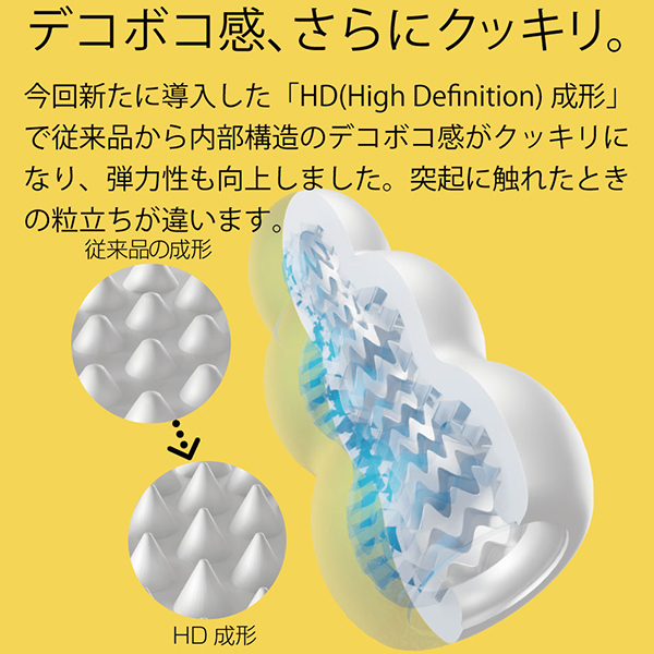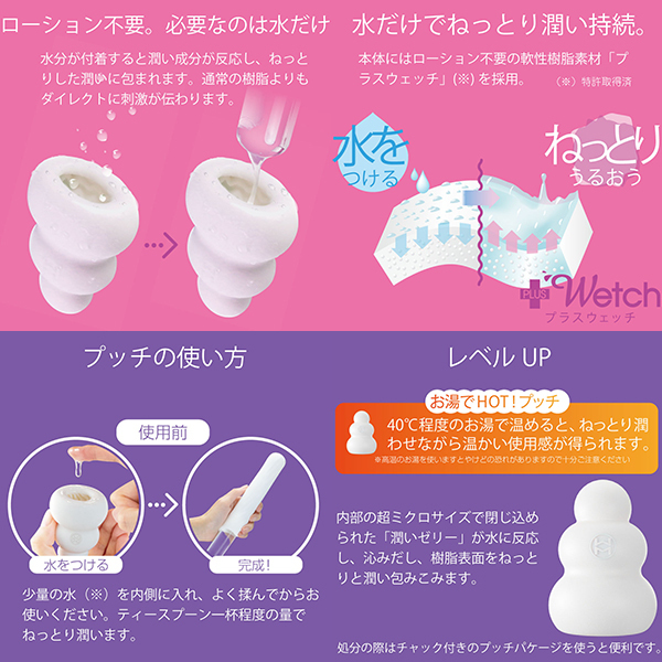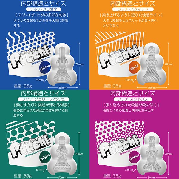 仕様:パッケージ:8.0×13.0×6.5cm 本体:全長7.0×直径5.0cm全てが新しくなったプッチ。ポケットサイズのローション不要ホールプッチシリーズが生まれ変わって新登場。軟性素材から内部の構造、パッケージ、全てが新しくなりました。デコボコ感、さらにクッキリ。今回新たに導入した「HD(High Definition)成形」で突起のデコボコ感がさらにクッキリになりました。突起に触れたときの粒立ちが違います。弾力感、さらにモッチリ。「HD 成形」により軟性樹脂の弾力性も向上。さらにモッチモチに、しなやかな素材になりました。内部構造も、さらにハッキリ。オリジナルシリーズ、スイーツシリーズ計8種類の内部構造をより精密な造形にリニューアル。「HD 成形」とあいまってデコボコ感がよりハッキリわかる構造になりました。生産工場を一新。新型プッチシリーズは日本国内に新設した工場から生産。最新の設備と厳密な品質管理で一つ一つ丁寧に作ります。ローション不要、必要なのは水だけ。ローション不要軟性素材「プラスウェッチ」水分が付着すると潤い成分が反応、ねっとりした潤いに包まれます。<クリオネ内部構造>「スジ・イボ・ヒダの多彩な刺激」大ぶりの突起たちが全体を大胆に刺激する<ジェリーフィッシュ内部構造>「動かすたびに突起が弾ける刺激」長めに作られた突起が全体を弾いて刺激する<オクトパス内部構造>「張り巡らされた吸盤が吸い付く」吸盤とイボが密着し快感を生み出す<スクイッド内部構造>「突き上げるように延びた快感ライン」大きく隆起をしたスリットが奥へ奥へといざなう |