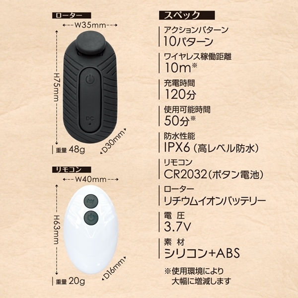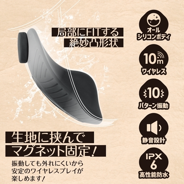 仕様:パッケージ:10.0×10.0×3.5cm 本体:ローター7.5×3.5×3.0cm、リモコン6.3×4.0×1.6cm 重量:68g USB充電式マグネットで挟んでピッタリFITする静音ワイヤレスローター。ズレにくくピンポイントで好きな所でローターを固定出来るのでより集中してプレイを楽しめます。肌触りが滑らかな高品質シリコン素材採用。ワイヤレス稼働距離10M、120分の充電で最大50分使用可能、ローター部分はIPX6の高レベル防水なのでしっかり洗えて衛生的にも安心してお使い頂けます。※使用環境により電池の減りは大幅に増減します●ブラック |
